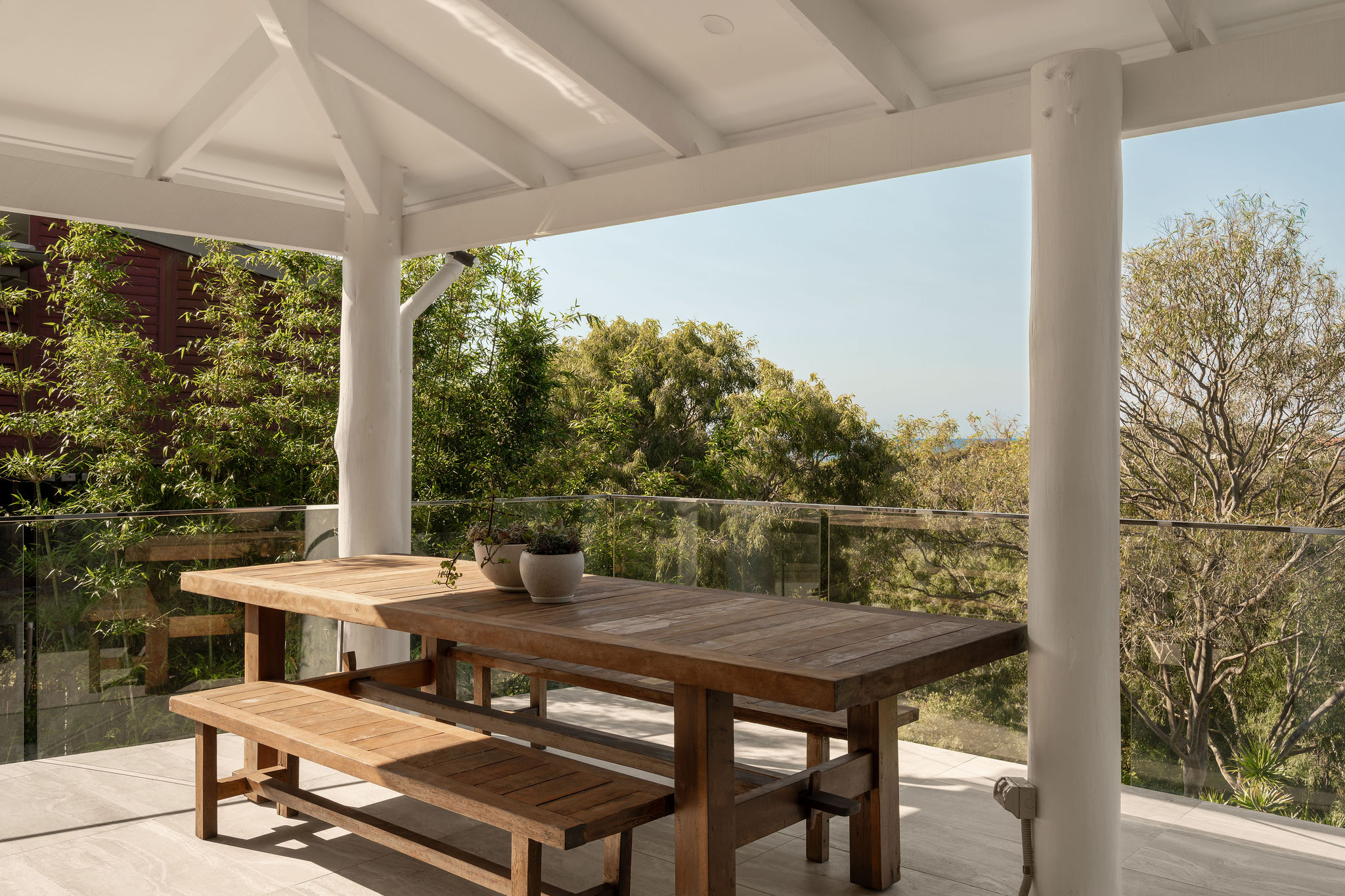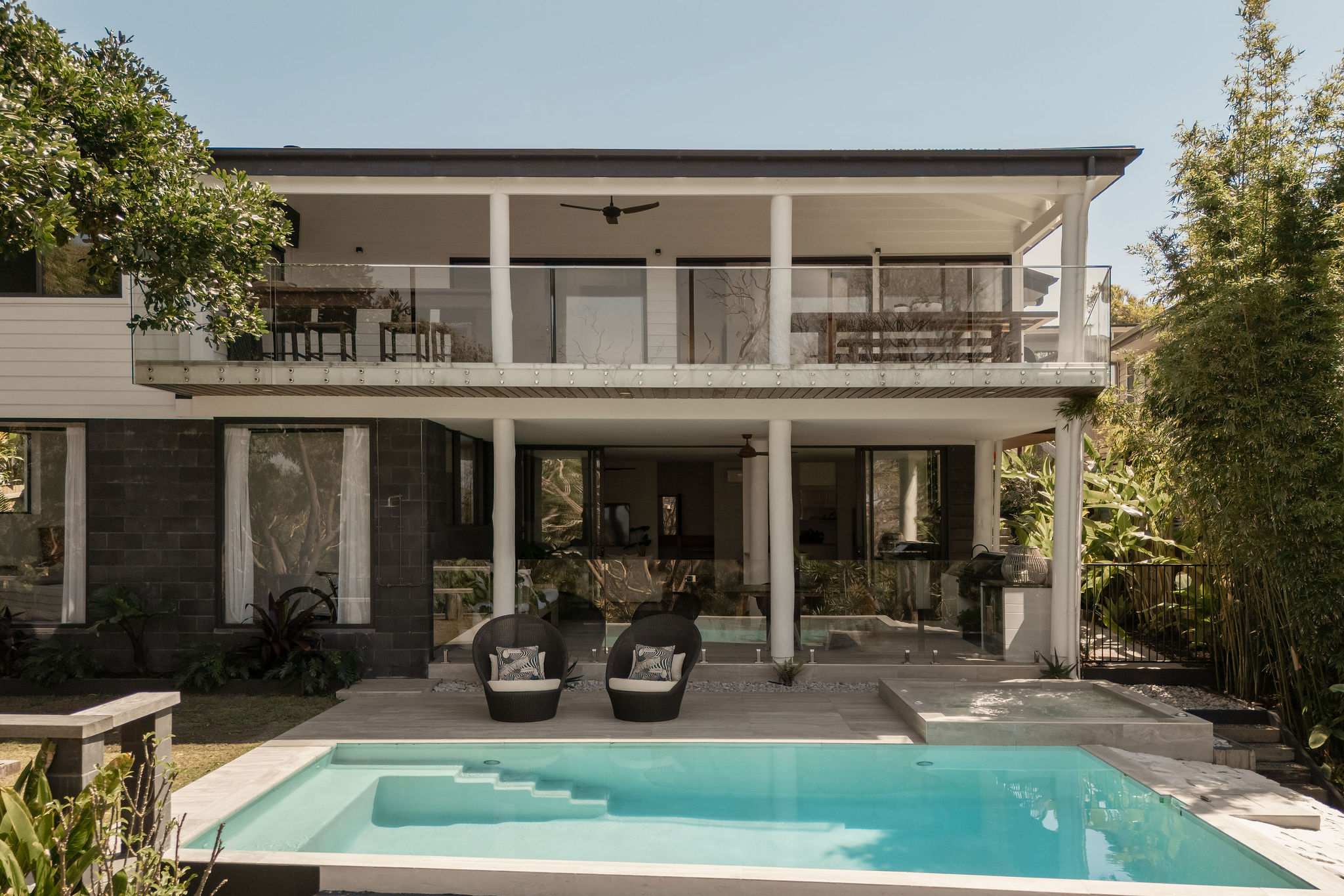Spread across two generous levels, the design blurs the line between inside and out on both. Walls of glass sliders open to a sun-drenched balcony and lower pool terrace, pulling light and sea breeze through every space.
