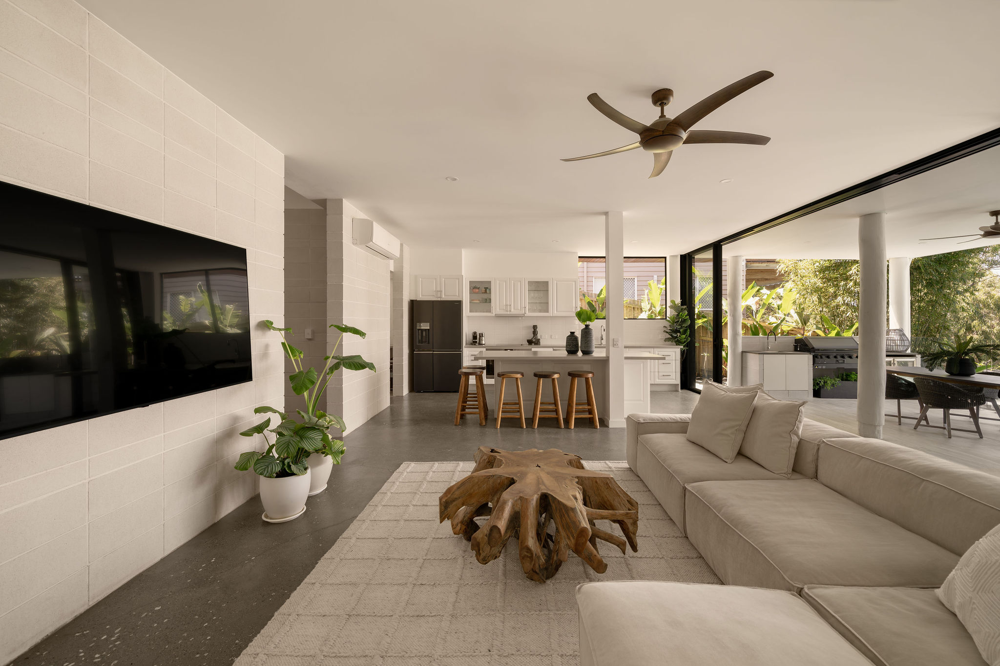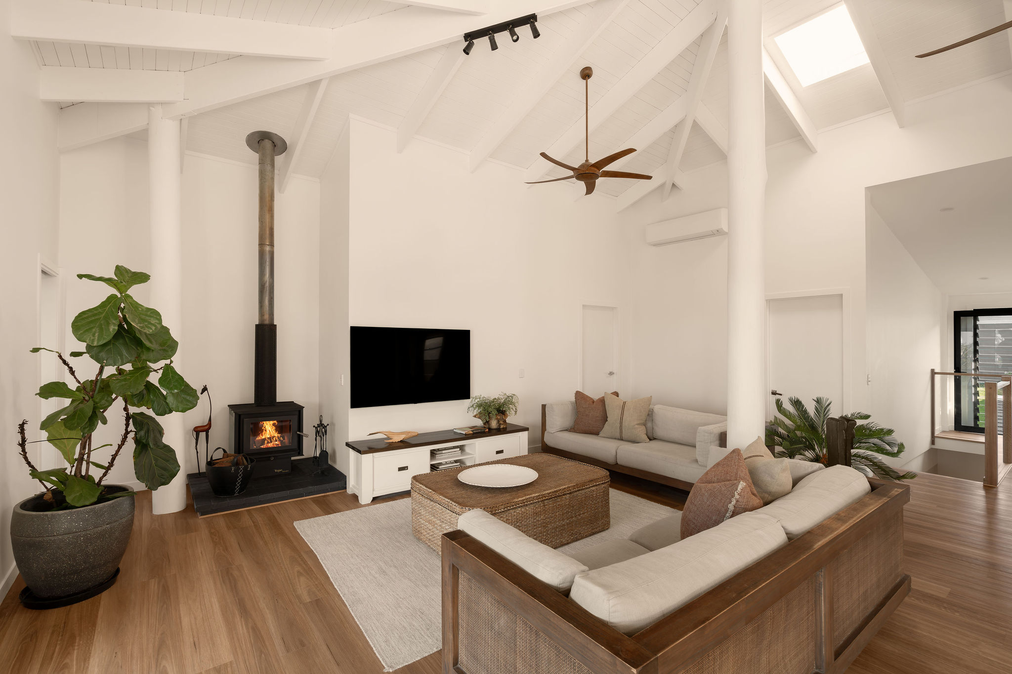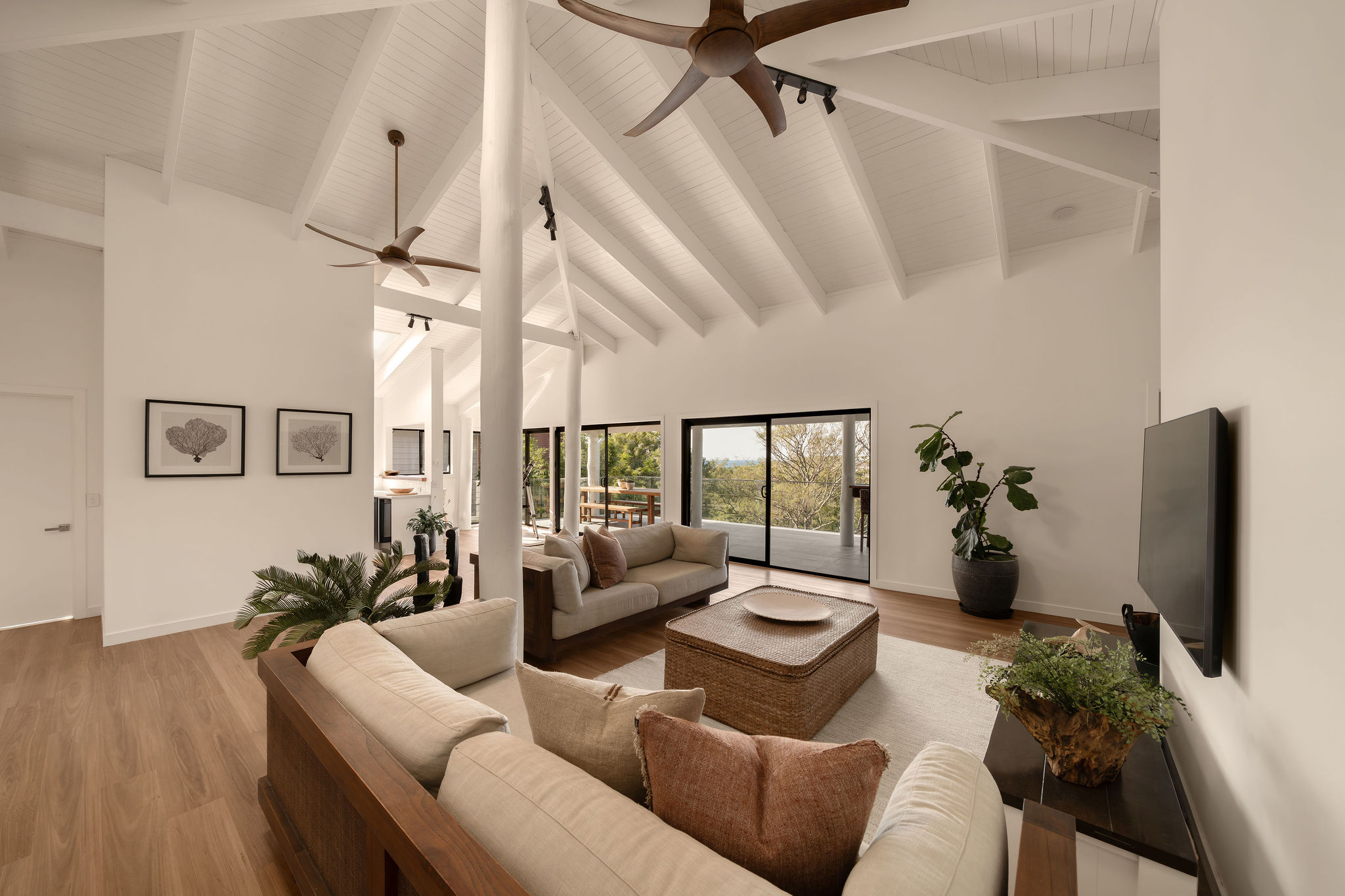 Vaulted ceilings and raw block work finishes layer scale with softness through multiple living zones, anchored by the original poles that have been incorporated into its new outfit.