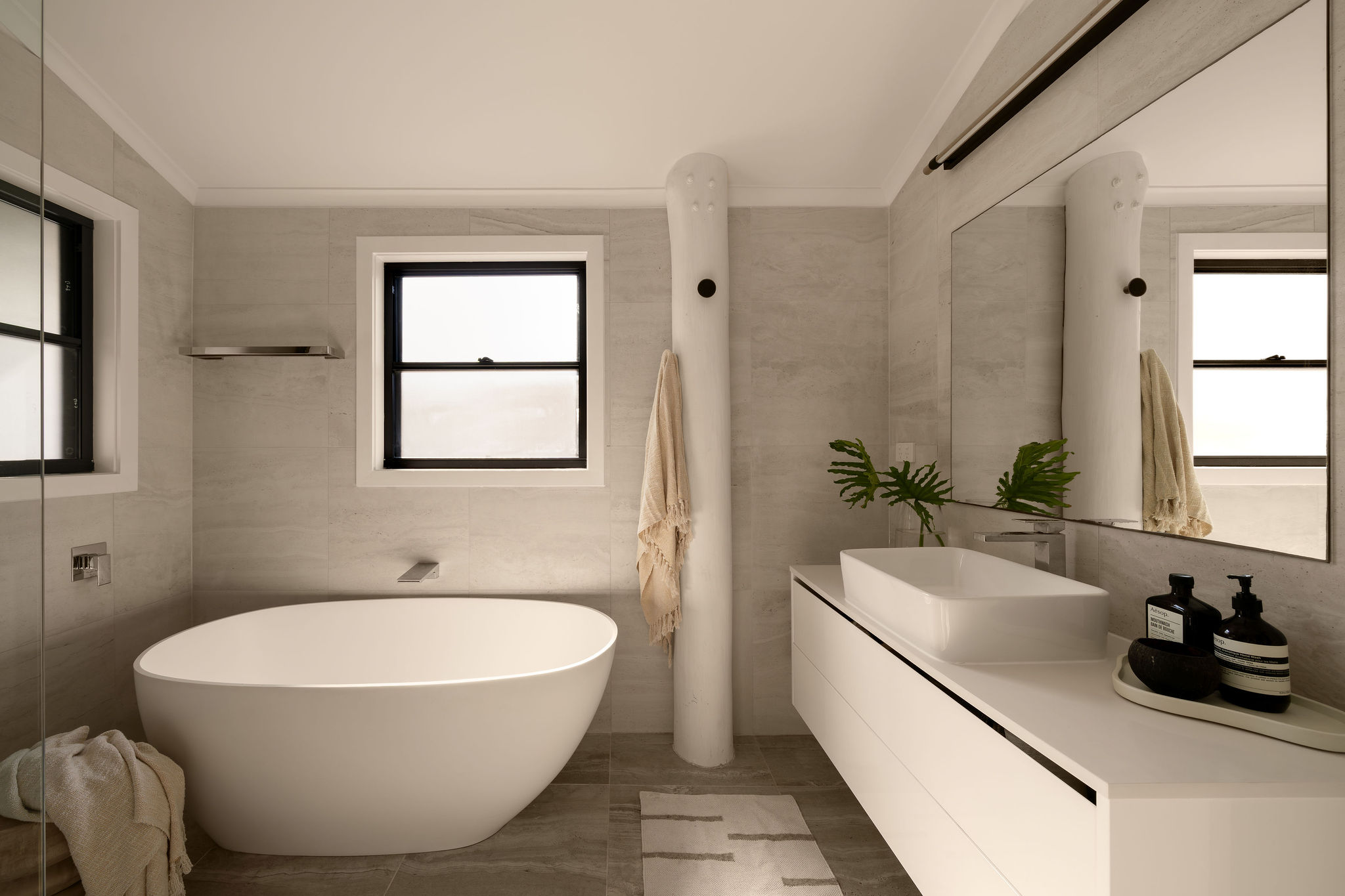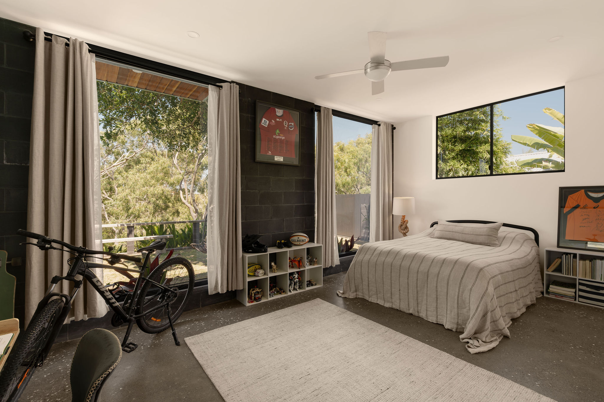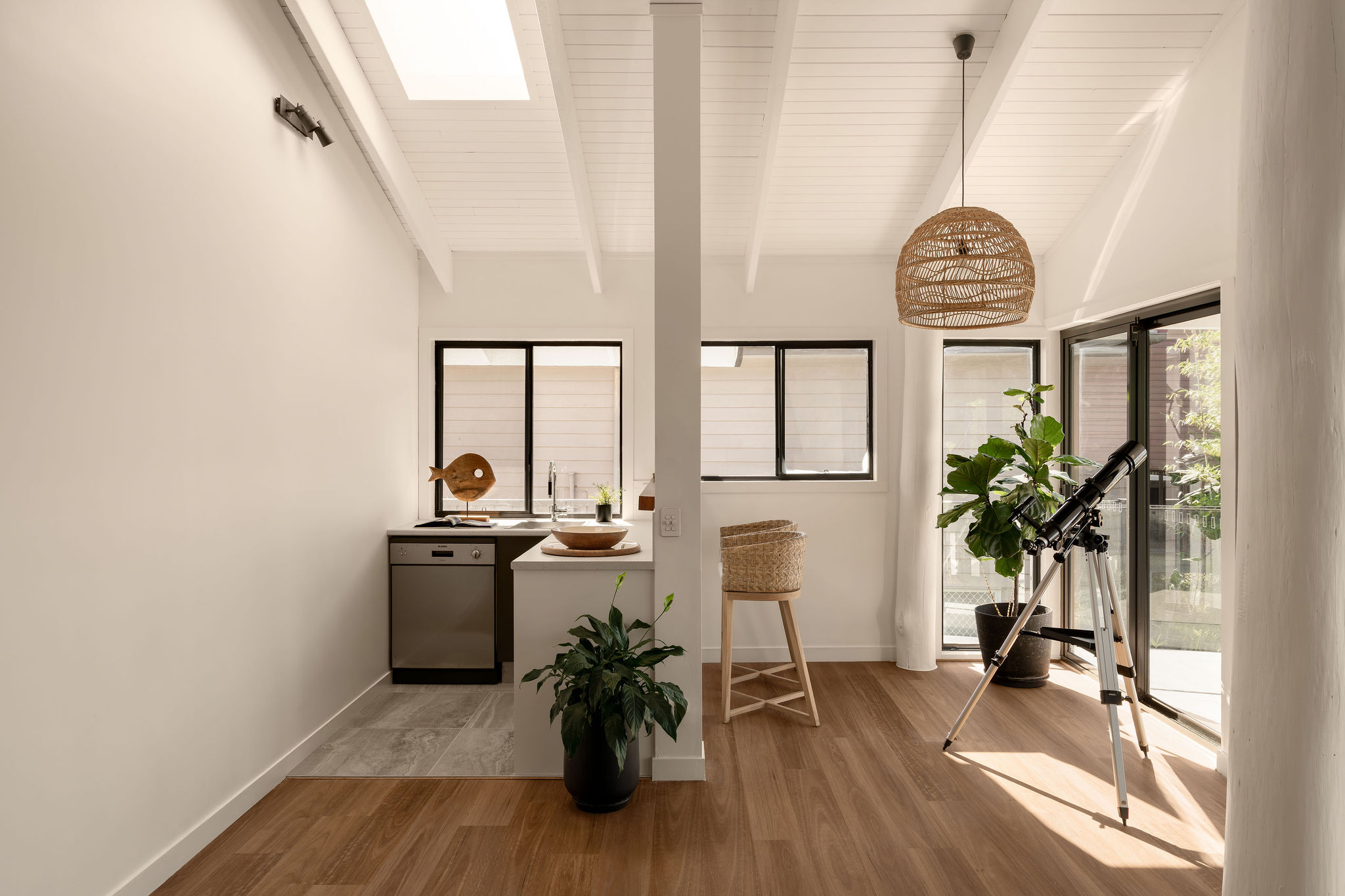 Vaulted ceilings and raw block work finishes layer scale with softness through multiple living zones, anchored by the original poles that have been incorporated into its new outfit.