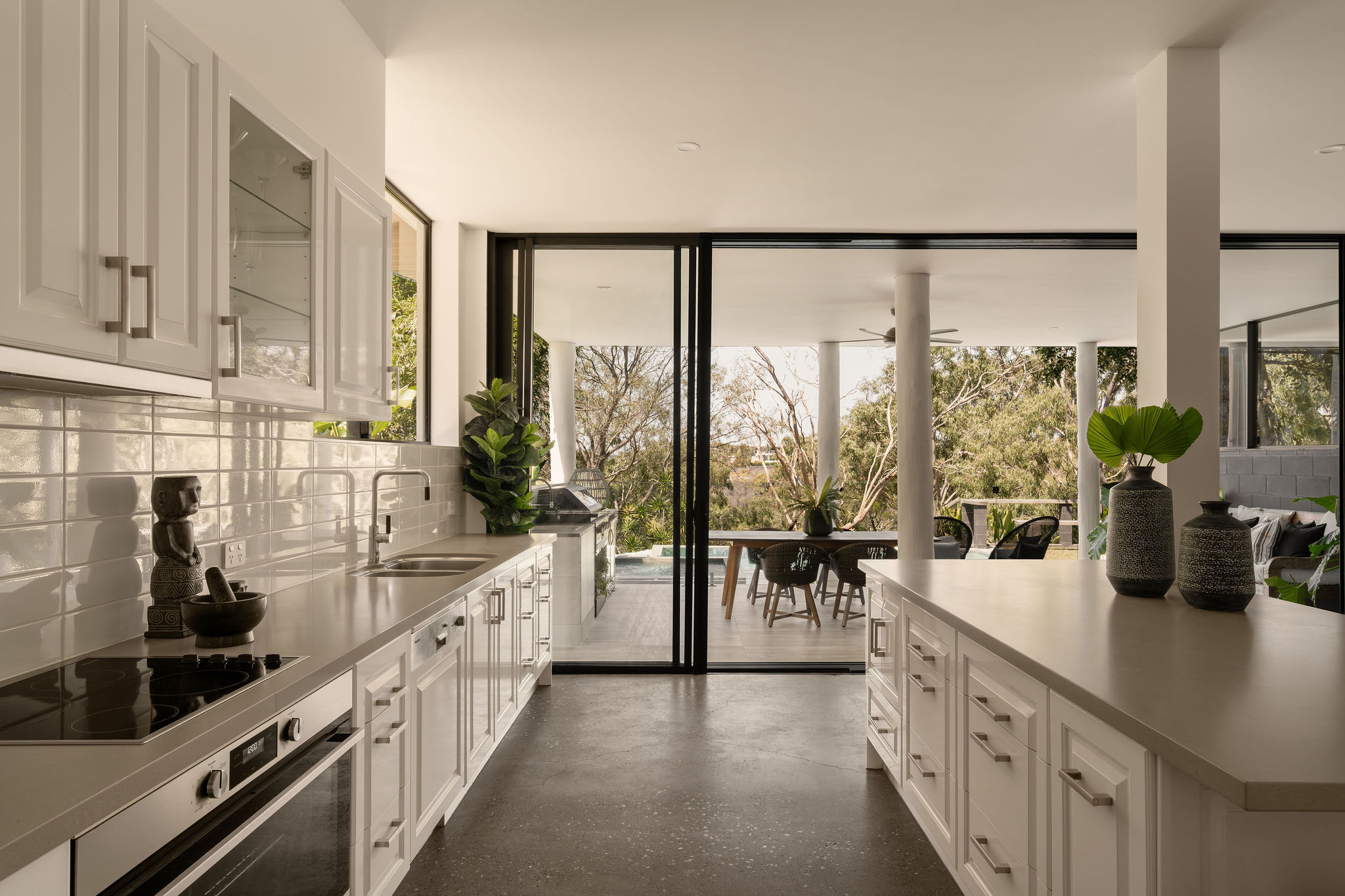 An outdoor kitchen compliments an alfresco lifestyle, set alongside a spa and family sized pool framed by a lush level lawn and private national park setting.