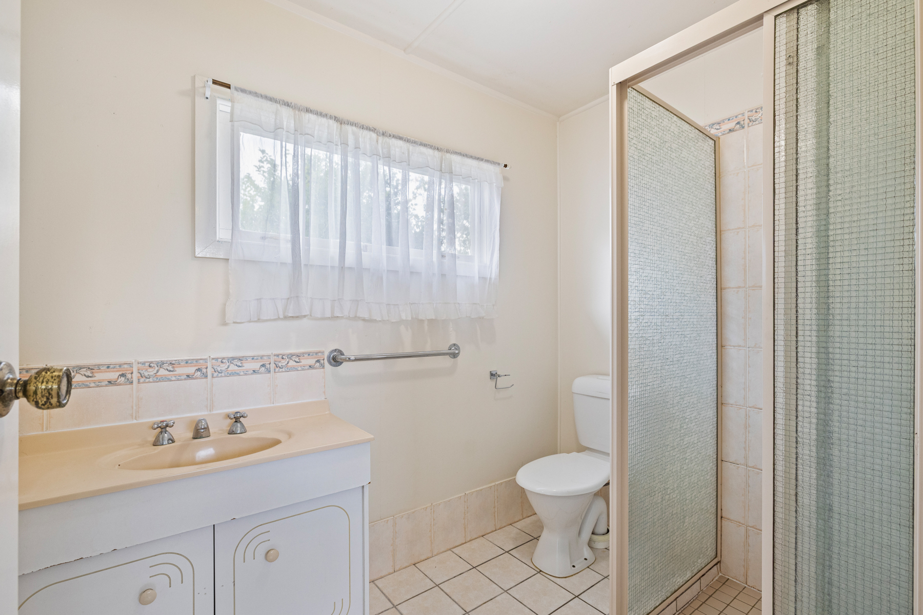 The main bathroom includes a shower over bath, vanity with storage, and a linen cupboard, while a separate toilet with its own hand basin adds everyday convenience.