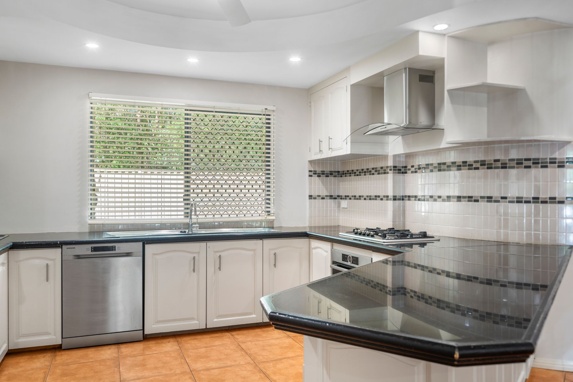 • Modern kitchen with gas cooktop, dishwasher and breakfast bar