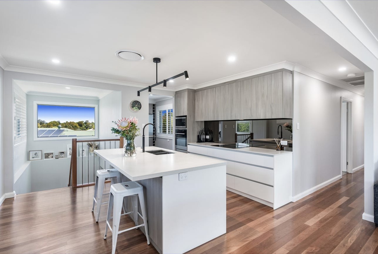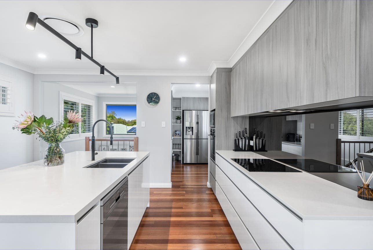 • Modern kitchen with 40mm Caesarstone island bench, induction cooktop, oven, butler’s pantry and soft-close cabinetry