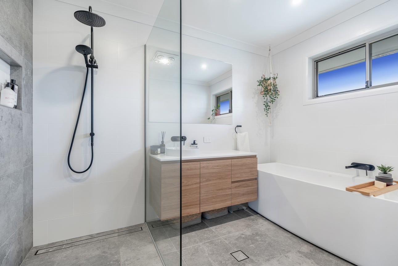 • Stylish main bathroom with floor-to-ceiling tiles, matte black fixtures and bathtub