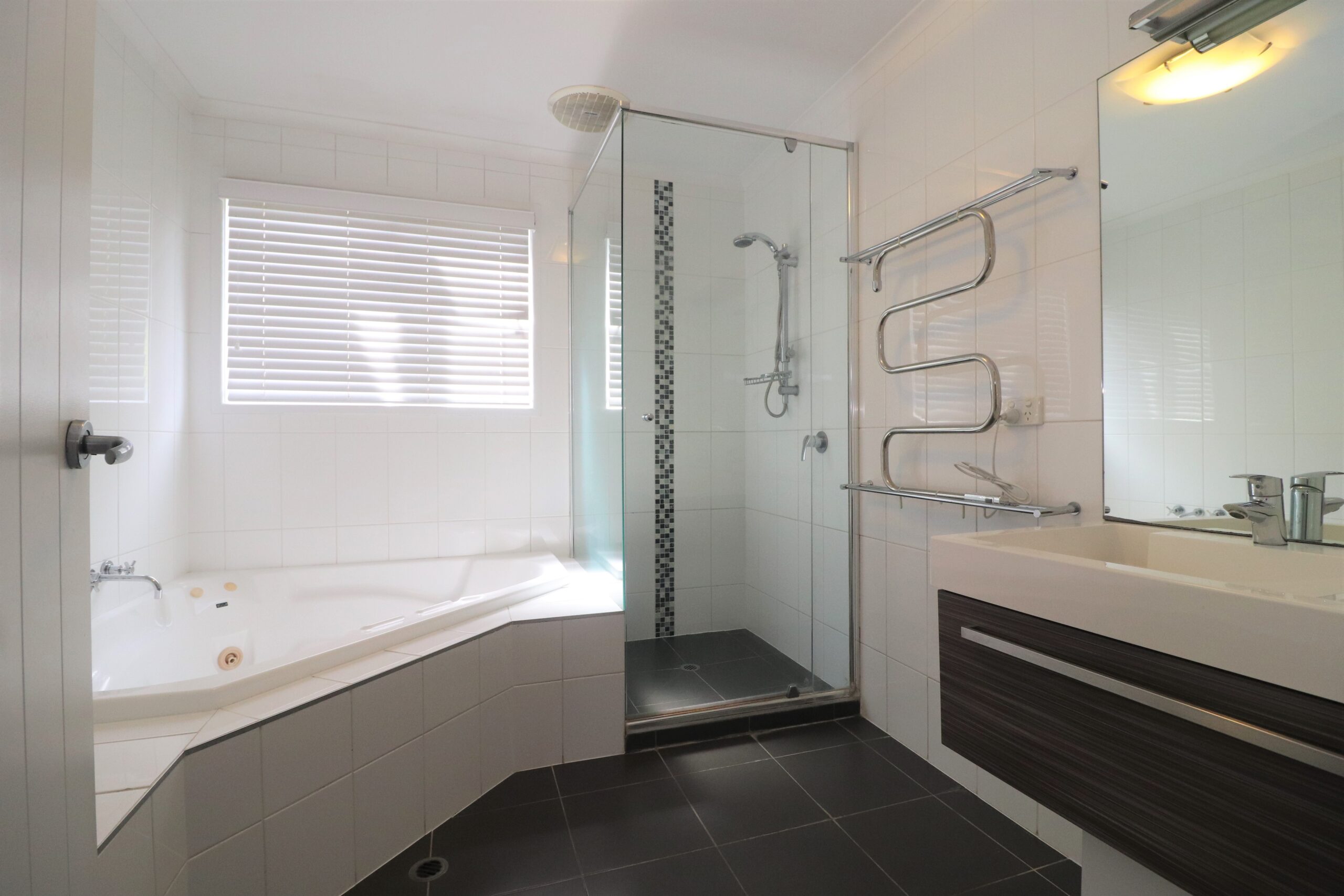 One well-appointed bathroom with both a shower and a corner spa, plus the convenience of two separate toilets